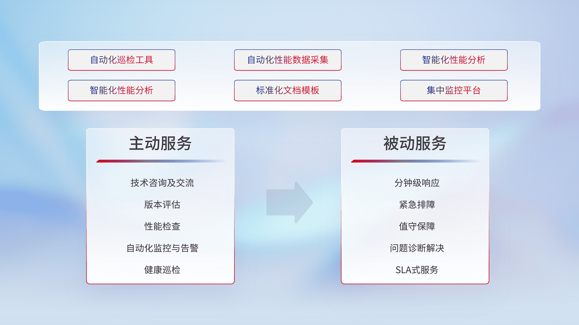 智能化工具和标准化文档,,,,保障服务质量,,,提供主动服务(包含技术咨询、、、、版本评估、、性能检查、、、、自动化监控与告警、、健康巡检)和被动服务包含(分钟级响应、、紧急排障、、、、值守保障、、、问题诊断解决、、、SLA服务)。。
